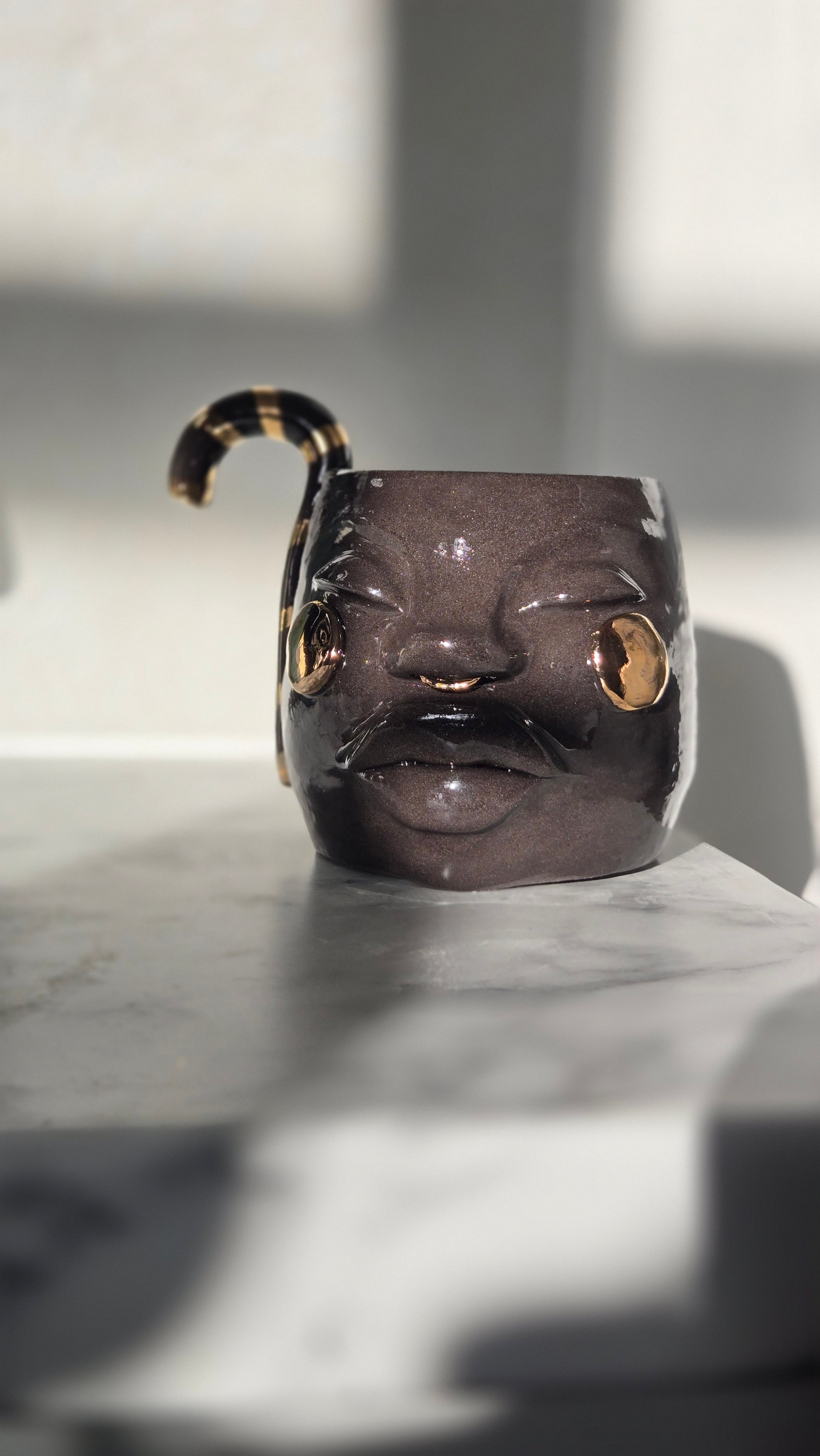 This one of one Christmas themed mug with a candy cane inspired handle has been thrown on the pottery wheel to form it's shape using black earthenware clay, then is meticulously hand sculpted for hours before being slowly dried and bisque, glaze and lustre fired three times in the kiln to achieve its final look. Weeks of hard work, craftsmanship and love to create a beautiful piece of art which can be used for consumption. Due to use of gold, do not put this item in the microwave! Hand wash after use, holds approx 300ml